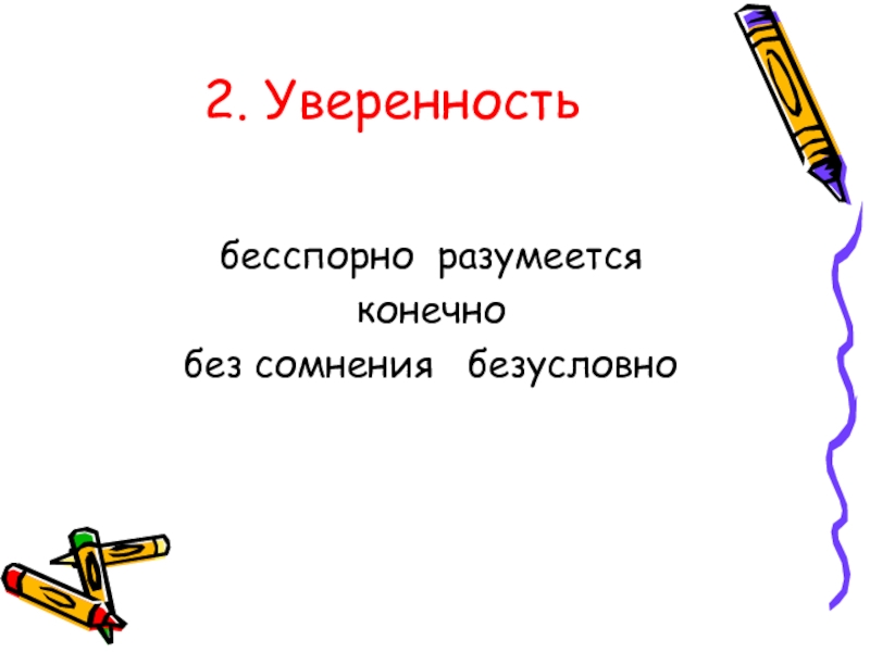2. Уверенностьбесспорно разумеется конечнобез сомнения  безусловно