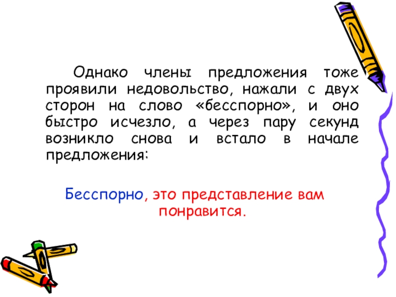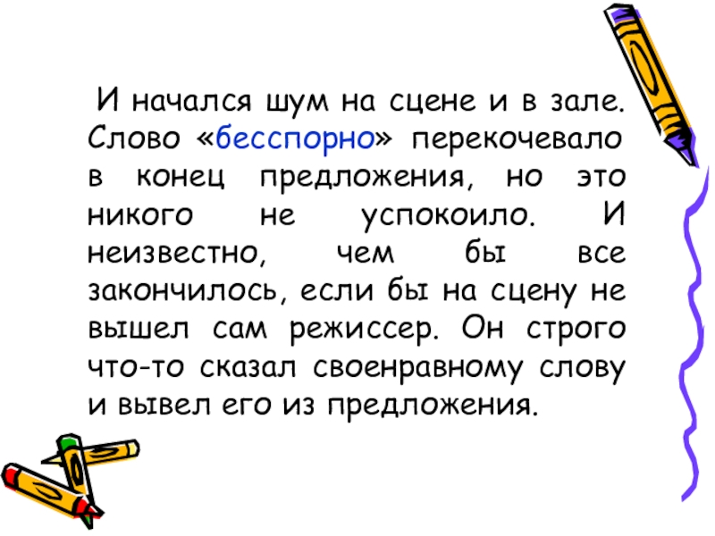 «бесспорно» перекочевало в конец предложения, но это никого не успокоило. И неизвестно, чем бы все закончилось, если бы на сцену не вышел сам режиссер. Он строго что-то сказал своенравному слову и вывел его из предложения.