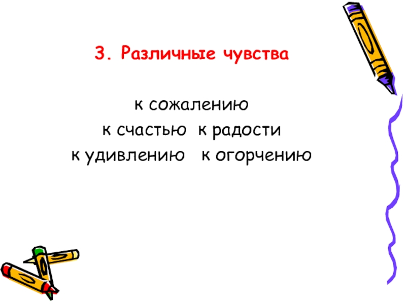 3. Различные чувствак сожалению к счастью к радостик удивлению  к огорчению