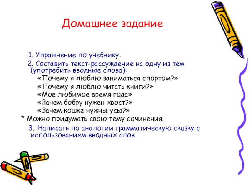 Домашнее задание  1. Упражнение по учебнику.  2. Составить текст-рассуждение на одну из тем (употребить вводные