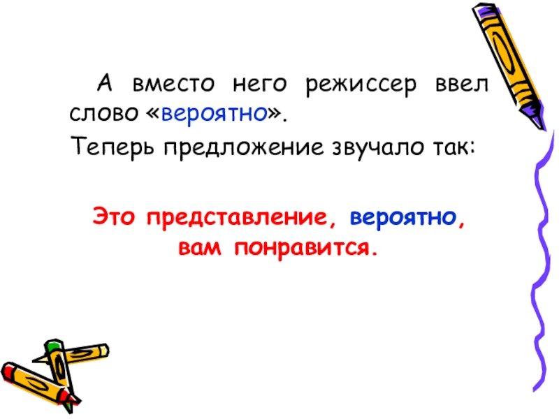 А вместо него режиссер ввел слово «вероятно».  Теперь предложение звучало так:  Это представление,