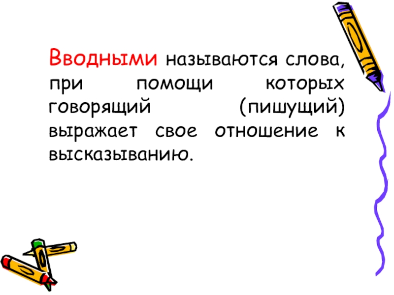 Вводными называются слова, при помощи которых говорящий (пишущий) выражает свое отношение к высказыванию.