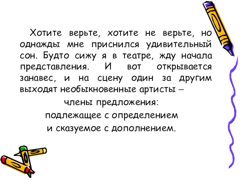 Хотите верьте, хотите не верьте, но однажды мне приснился удивительный сон. Будто сижу я в театре, жду начала представления. И вот открывается занавес, и на сцену один за другим выходят необыкновенные артисты – члены