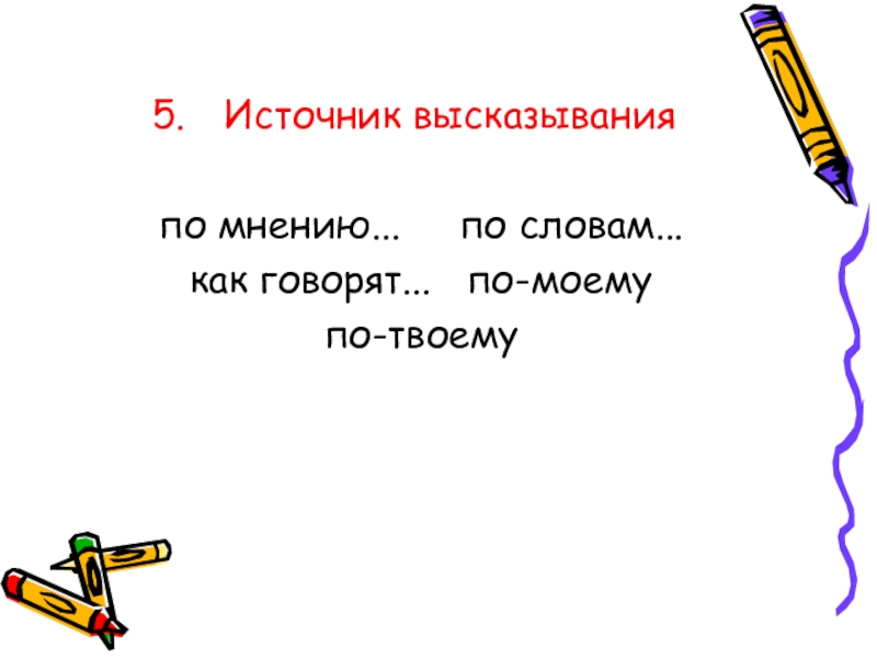Источник высказыванияпо мнению...   по словам...  как говорят...  по-моему  по-твоему