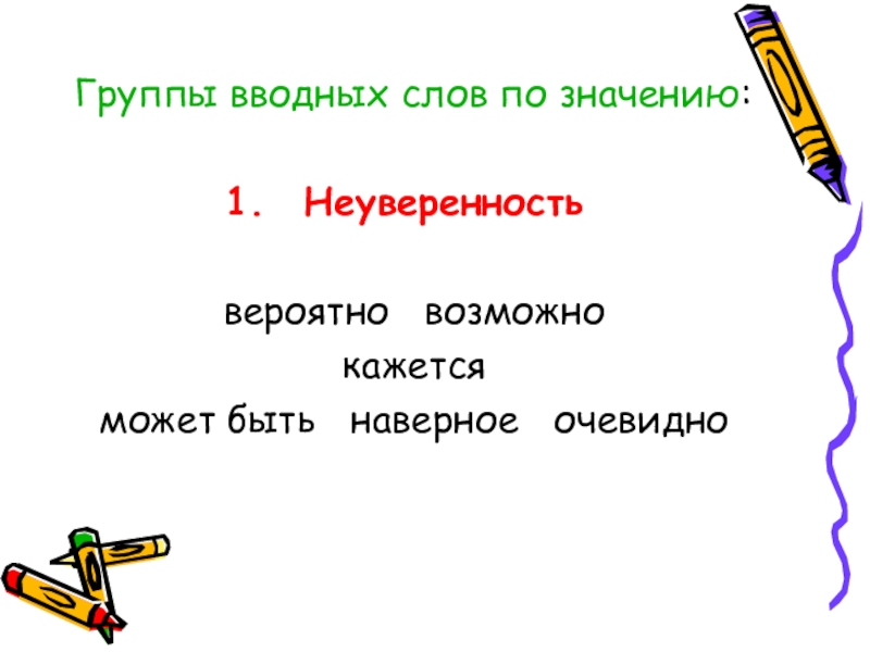 Группы вводных слов по значению:Неуверенностьвероятно  возможно кажетсяможет быть  наверное  очевидно