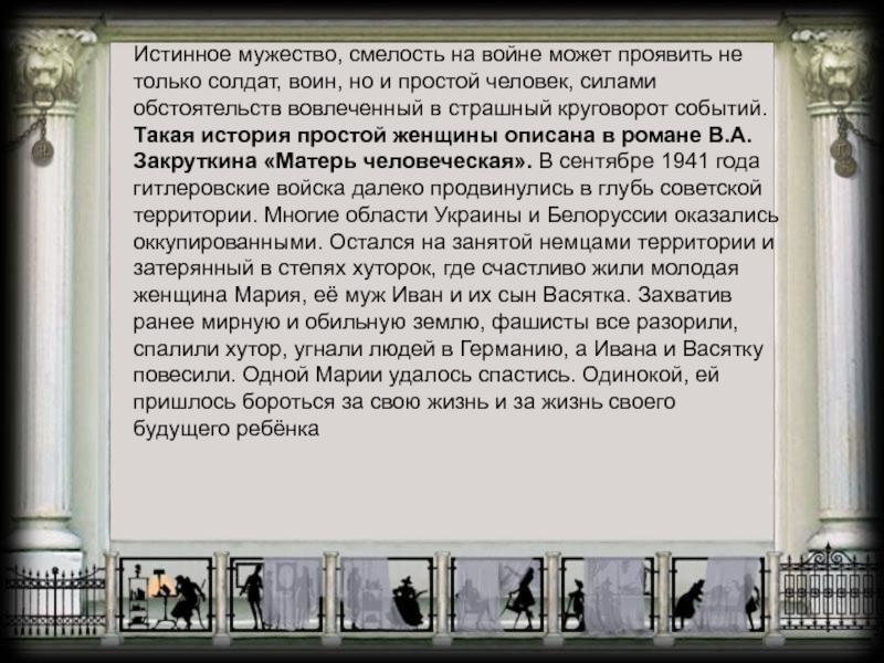 воин, но и простой человек, силами обстоятельств вовлеченный в страшный круговорот событий. Такая история простой женщины описана в романе В.А. Закруткина «Матерь человеческая». В сентябре 1941 года гитлеровские войска далеко продвинулись в глубь советской территории. Многие области Украины и Белоруссии оказались оккупированными. Остался на занятой немцами территории и затерянный в степях хуторок, где счастливо жили молодая женщина Мария, её муж Иван и их сын Васятка. Захватив ранее мирную и обильную землю, фашисты все разорили, спалили хутор, угнали людей в Германию, а Ивана и Васятку повесили. Одной Марии удалось спастись. Одинокой, ей пришлось бороться за свою жизнь и за жизнь своего будущего ребёнка