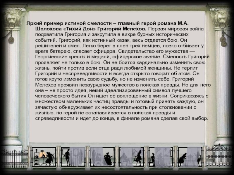 Дон» Григорий Мелехов. Первая мировая война подхватила Григория и закрутила в вихре бурных исторических событий. Григорий, как истинный казак, весь отдается бою. Он решителен и смел. Легко берет в плен трех немцев, ловко отбивает у врага батарею, спасает офицера. Свидетельство его мужества — Георгиевские кресты и медали, офицерское звание. Смелость Григорий проявляет не только в бою. Он не боится кардинально изменить свою жизнь, пойти против воли отца ради любимой женщины. Не терпит Григорий и несправедливости и всегда открыто говорит об этом. Он готов круто изменить свою судьбу, но не изменить себе. Григорий Мелехов проявил незаурядное мужество в поисках правды. Но для него она – не просто идея, некий идеализированный символ лучшего человеческого бытия.Он ищет её воплощение в жизни. Соприкасаясь с множеством маленьких частиц правды и готовый принять каждую, он зачастую обнаруживает их несостоятельность при столкновении с жизнью, но герой не останавливается в поисках правды и справедливости и идет до конца, в финале романа сделав свой выбор.