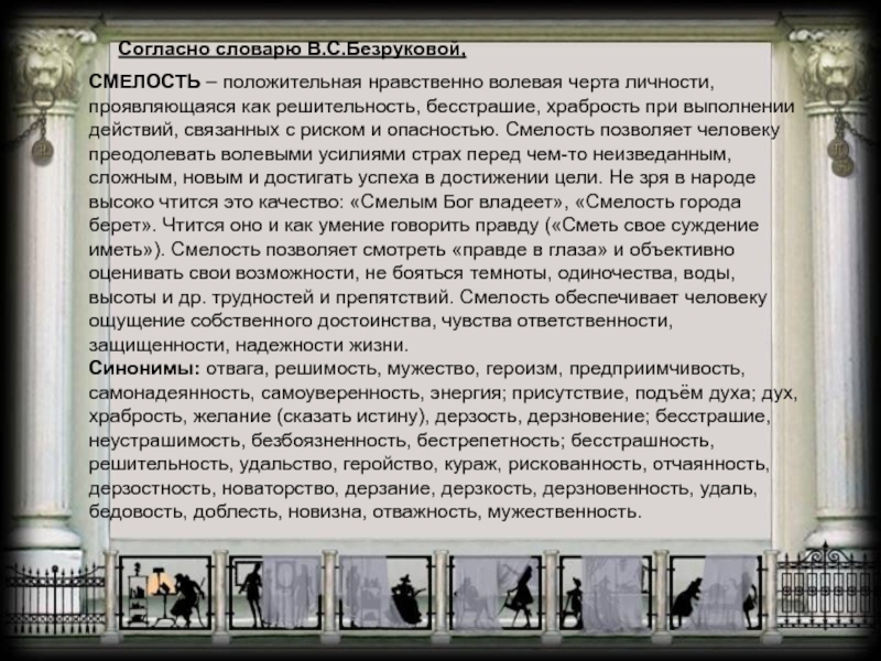 как решительность, бесстрашие, храбрость при выполнении действий, связанных с риском и опасностью. Смелость позволяет человеку преодолевать волевыми усилиями страх перед чем-то неизведанным, сложным, новым и достигать успеха в достижении цели. Не зря в народе высоко чтится это качество: «Смелым Бог владеет», «Смелость города берет». Чтится оно и как умение говорить правду («Сметь свое суждение иметь»). Смелость позволяет смотреть «правде в глаза» и объективно оценивать свои возможности, не бояться темноты, одиночества, воды, высоты и др. трудностей и препятствий. Смелость обеспечивает человеку ощущение собственного достоинства, чувства ответственности, защищенности, надежности жизни.
