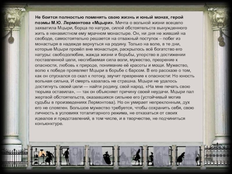 М.Ю. Лермонтова «Мцыри». Мечта о вольной жизни всецело захватила Мцыри, борца по натуре, силой обстоятельств вынужденного жить в ненавистном ему мрачном монастыре. Он, ни дня не живший на свободе, самостоятельно решается на отважный поступок – побег из монастыря в надежде вернуться на родину. Только на воле, в те дни, которые Мцыри провёл вне монастыря, раскрылось всё богатство его натуры: свободолюбие, жажда жизни и борьбы, упорство в достижении поставленной цели, несгибаемая сила воли, мужество, презрение к опасности, любовь к природе, понимание её красоты и мощи. Мужество, волю к победе проявляет Мцыри в борьбе с барсом. В его рассказе о том, как он спускался со скал к потоку, звучит презрение к опасности: Но юность вольная сильна, И смерть казалась не страшна. Мцыри не удалось достигнуть своей цели — найти родину, свой народ. «На мне печать свою тюрьма оставила», — так он объясняет причину своей неудачи. Мцыри пал жертвой обстоятельств, оказавшихся сильнее его (устойчивый мотив судьбы в произведениях Лермонтова). Но он умирает непреклонным, дух его не сломлен. Большое мужество требуется, чтобы сохранить себя, свою личность в условиях тоталитарного режима, не отказаться от своих идеалов и представлений, в том числе, и в творчестве, не подчиниться конъюнктуре.