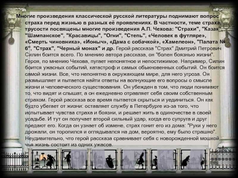 разных её проявлениях. В частности, теме страха, трусости посвящены многие произведения А.П. Чехова: "Страхи", "Казак", "Шампанское", "Красавицы", "Огни", "Степь", «Человек в футляре», «Смерть чиновника», «Ионыч», «Дама с собачкой», «Хамелеон», "Палата № 6", "Страх", "Черный монах" и др. Герой рассказа "Страх" Дмитрий Петрович Силин боится всего. По мнению автора рассказа, он "болен боязнью жизни". Героя, по мнению Чехова, пугает непонятное и непостижимое. Например, Силин боится ужасных событий, катастроф и самых обыкновенных событий. Он боится самой жизни. Все, что непонятно в окружающем мире, для него угроза. Он размышляет и пытается найти ответы на волнующие его вопросы о смысле жизни и человеческого существования. Он убежден в том, что люди понимают то, что видят и слышат, а он ежедневно отравляет себя своим собственным страхом. Герой рассказа все время пытается скрыться и уединиться. Он как будто убегает от жизни: оставляет службу в Петербурге из-за того, что испытывает чувства страха и боязни, и решает жить в одиночестве в своей усадьбе. И тут он получает второй сильный удар, когда его супруга и друг предают его. Когда он узнает об измене, страх гонит его из дома: "Руки у него дрожали, он торопился и оглядывался на дом, вероятно, ему было страшно". Неудивительно, что герой рассказа сравнивает себя с новорожденной мошкой, чья жизнь состоит из одних ужасов.
