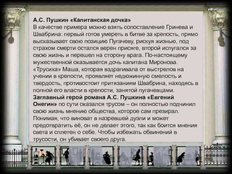 и Швабрина: первый готов умереть в битве за крепость, прямо высказывает свою позицию Пугачеву, рискуя жизнью, под страхом смерти остался верен присяге, второй испугался за свою жизнь и перешел на сторону врага. По-настоящему мужественной оказывается дочь капитана Миронова. «Трусиха» Маша, которая вздрагивала от выстрелов на учении в крепости, проявляет недюжинную смелость и твердость, противостоит притязаниям Швабрина, находясь в полной его власти в крепости, занятой пугачевцами. Заглавный герой романа А.С. Пушкина «Евгений Онегин» по сути оказался трусом – он полностью подчинил свою жизнь мнению общества, которое сам презирал. Понимая, что виноват в назревшей дуэли и может предотвратить её, он не делает этого, так как боится мнения света и сплетен о себе. Чтобы избежать обвинений в трусости, он убивает своего друга.