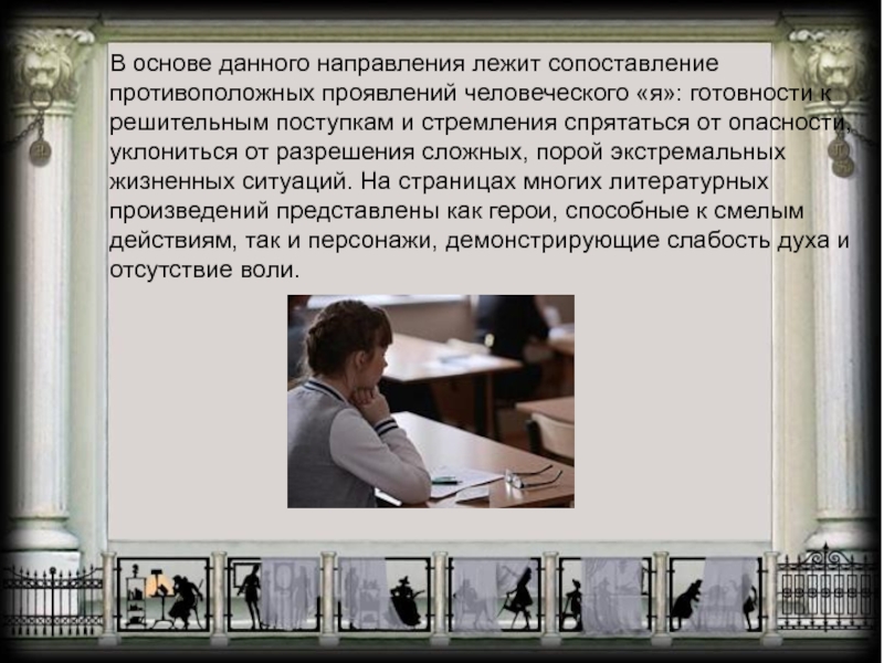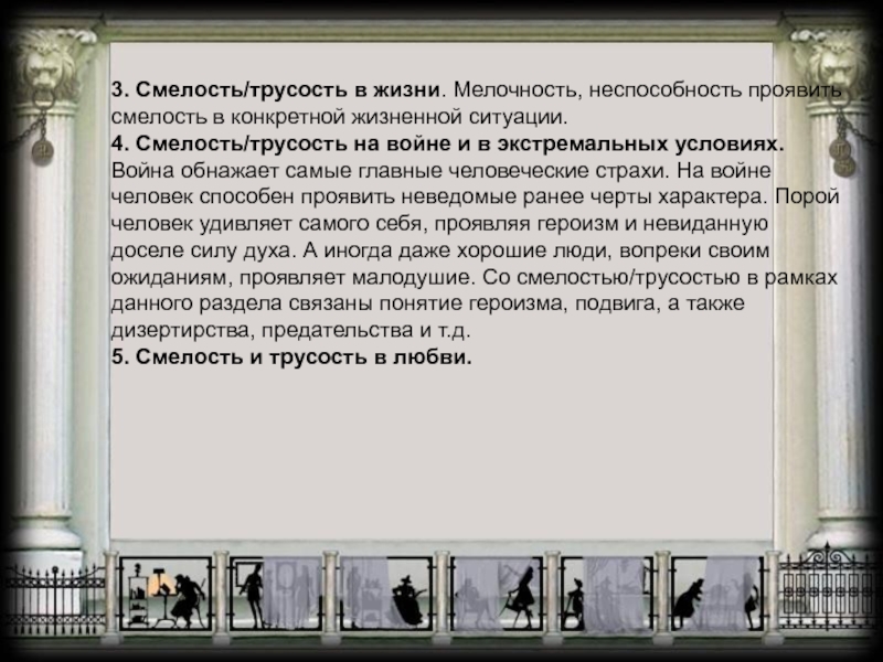 к решительным поступкам и стремления спрятаться от опасности, уклониться от разрешения сложных, порой экстремальных жизненных ситуаций. На страницах многих литературных произведений представлены как герои, способные к смелым действиям, так и персонажи, демонстрирующие слабость духа и отсутствие воли.