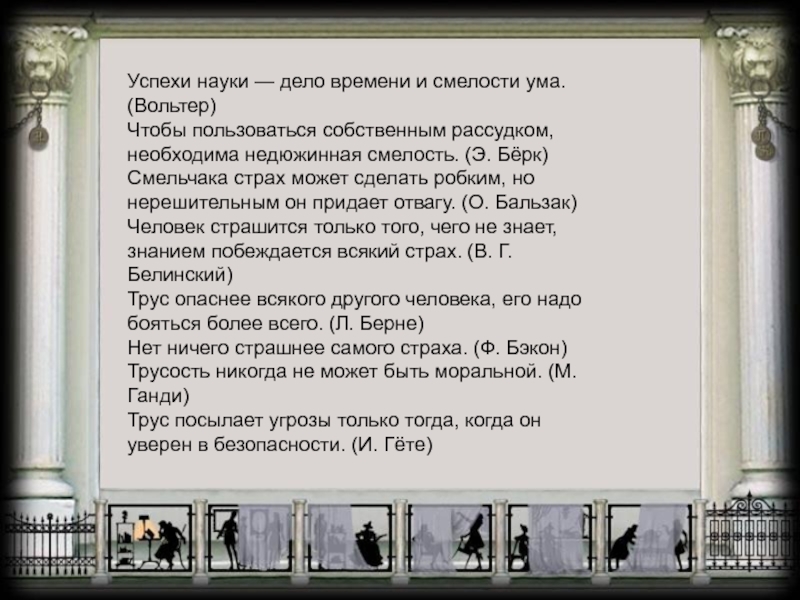 собственным рассудком, необходима недюжинная смелость. (Э. Бёрк) Смельчака страх может сделать робким, но нерешительным он придает отвагу. (О. Бальзак) Человек страшится только того, чего не знает, знанием побеждается всякий страх. (В. Г. Белинский)