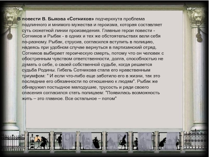 мужества и героизма, которая составляет суть сюжетной линии произведения. Главные герои повести - Сотников и Рыбак - в одних и тех же обстоятельствах вели себя по-разному. Рыбак, струсив, согласился вступить в полицию, надеясь при удобном случае вернуться в партизанский отряд. Сотников выбирает героическую смерть, потому что он человек с обостренным чувством ответственности, долга, способностью не думать о себе, о своей собственной судьбе, когда решается судьба Родины. Гибель Сотникова стала его нравственным триумфом: " И если что-либо еще заботило его в жизни, так это последние его обязанности по отношению к людям". Рыбак же обнаружил постыдное малодушие, трусость и ради своего спасения согласился стать полицаем: "Появилась возможность жить – это главное. Все остальное – потом"