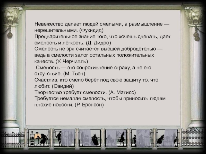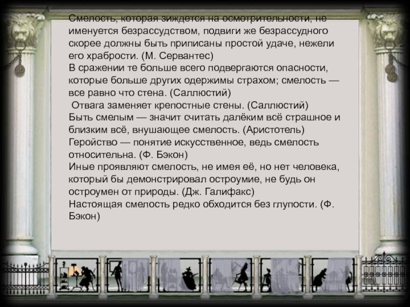 Быть смелым — значит считать далёким всё страшное и близким всё, внушающее смелость. (Аристотель) Геройство — понятие искусственное, ведь смелость относительна. (Ф. Бэкон)