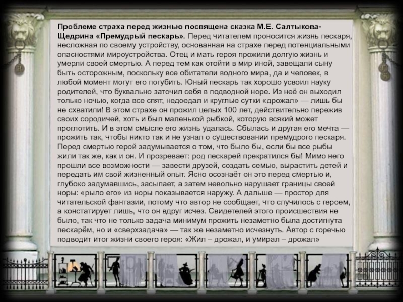 Слайд 25Проблеме страха перед жизнью посвящена сказка М.Е. Салтыкова- Щедрина «Премудрый пескарь».