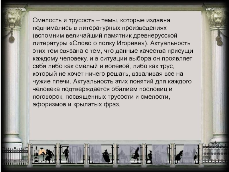 (вспомним величайший памятник древнерусской литературы «Слово о полку Игореве»). Актуальность этих тем связана с тем, что данные качества присущи каждому человеку, и в ситуации выбора он проявляет себя либо как смелый и волевой, либо как трус, который не хочет ничего решать, взваливая все на чужие плечи. Актуальность этих понятий для каждого человека подтверждается обилием пословиц и поговорок, посвященных трусости и смелости, афоризмов и крылатых фраз.
