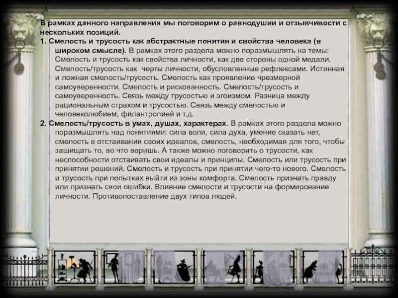 1. Смелость и трусость как абстрактные понятия и свойства человека (в широком смысле). В рамках этого раздела можно поразмышлять на темы: Смелость и трусость как свойства личности, как две стороны одной медали. Смелость/трусость как черты личности, обусловленные рефлексами. Истинная и ложная смелость/трусость. Смелость как проявление чрезмерной самоуверенности. Смелость и рискованность. Смелость/трусость и самоуверенность. Связь между трусостью и эгоизмом. Разница между рациональным страхом и трусостью. Связь между смелостью и человеколюбием, филантропией и т.д.