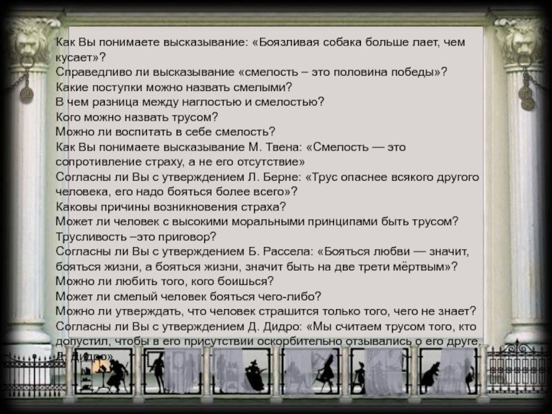 2. Смелость/трусость в умах, душах, характерах. В рамках этого раздела можно поразмышлять над понятиями: сила воли, сила духа, умение сказать нет, смелость в отстаивании своих идеалов, смелость, необходимая для того, чтобы защищать то, во что веришь. А также можно поговорить о трусости, как неспособности отстаивать свои идеалы и принципы. Смелость или трусость при принятии решений. Смелость и трусость при принятии чего-то нового. Смелость и трусость при попытках выйти из зоны комфорта. Смелость признать правду или признать свои ошибки. Влияние смелости и трусости на формирование личности. Противопоставление двух типов людей.