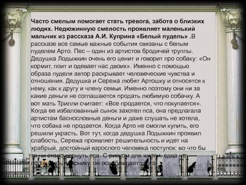проявляет маленький мальчик из рассказа А.И. Куприна «Белый пудель» .В рассказе все самые важные события связаны с белым пуделем Арто. Пес – один из артистов бродячей труппы. Дедушка Лодыжкин очень его ценит и говорит про собаку: «Он кормит, поит и одевает нас двоих». Именно с помощью образа пуделя автор раскрывает человеческие чувства и отношения. Дедушка и Сережа любят Артошку и относятся к нему, как к другу и члену семьи. Именно поэтому они ни за какие деньги не соглашаются продать любимую собачку. А вот мать Трилли считает: «Все продается, что покупается». Когда ее избалованный сынок захотел пса, она предлагала артистам баснословные деньги и даже слушать не хотела, что собака не продается. Когда Арто не смогли купить, его решили украсть. Вот тут, когда дедушка Лодыжкин проявил слабость, Сережа проявляет решительность и идет на храбрый, достойный взрослого человека поступок: во что бы то ни стало вернуть пса. С риском для жизни, едва не попавшись дворнику, он освобождает друга.