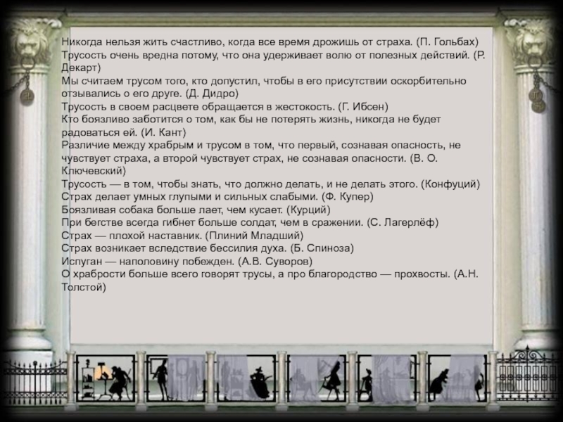 Гольбах) Трусость очень вредна потому, что она удерживает волю от полезных действий. (Р. Декарт)