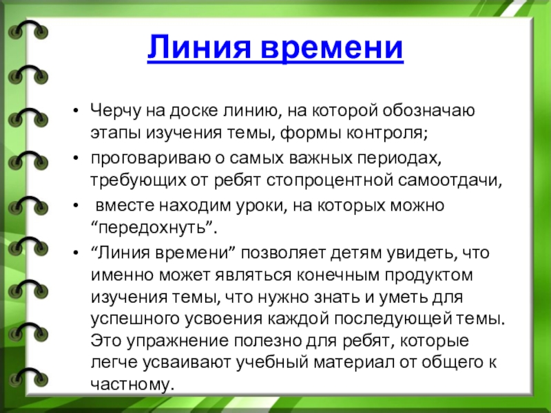 “Линия времени” позволяет детям увидеть, что именно может являться конечным продуктом изучения темы, что нужно знать и уметь для успешного усвоения каждой последующей темы. Это упражнение полезно для ребят, которые легче усваивают учебный материал от общего к частному.