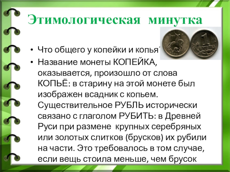 произошло от слова КОПЬЁ: в старину на этой монете был изображен всадник с копьем. Существительное РУБЛЬ исторически связано с глаголом РУБИТЬ: в Древней Руси при размене крупных серебряных или золотых слитков (брусков) их рубили на части. Это требовалось в том случае, если вещь стоила меньше, чем брусок
