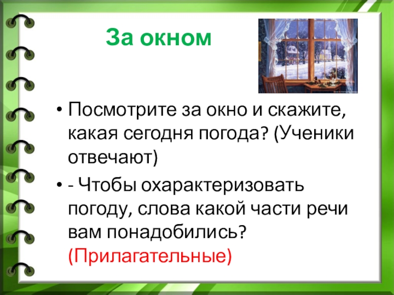 Посмотрите за окно и скажите, какая сегодня погода? (Ученики отвечают)