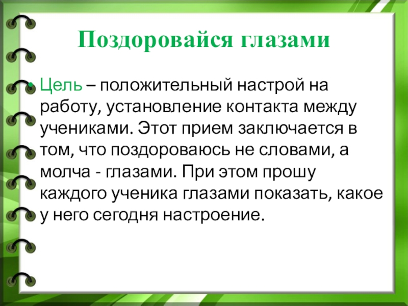 Этот прием заключается в том, что поздороваюсь не словами, а молча - глазами. При этом прошу каждого ученика глазами показать, какое у него сегодня настроение.