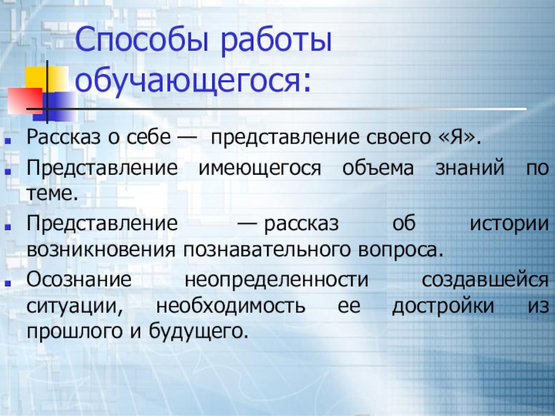 Представление — рассказ об истории возникновения познавательного вопроса.