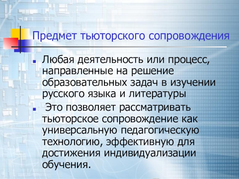 Это позволяет рассматривать тьюторское сопровождение как универсальную педагогическую технологию, эффективную для достижения индивидуализации обучения.