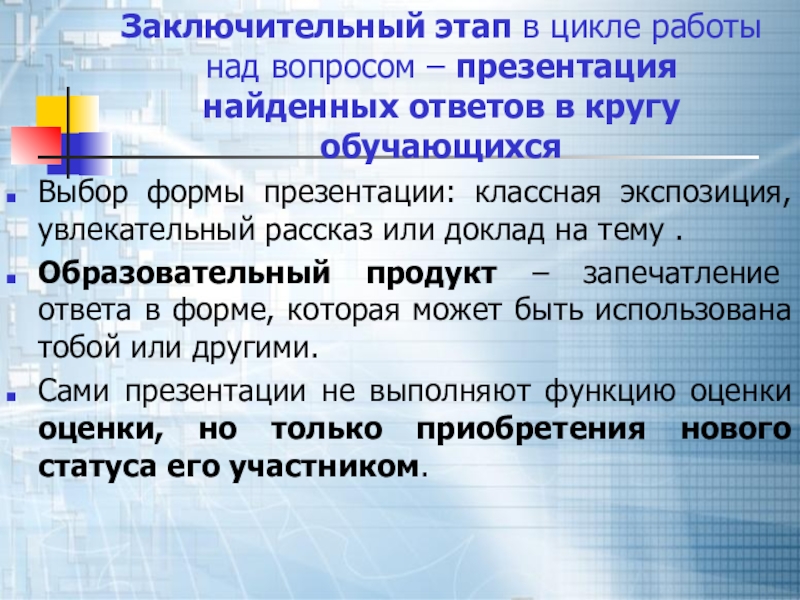 Слайд 22Заключительный этап в цикле работы над вопросом – презентация найденных ответов