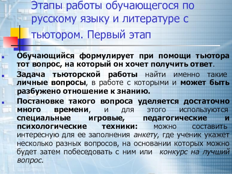 Слайд 19Этапы работы обучающегося по русскому языку и литературе с тьютором. Первый