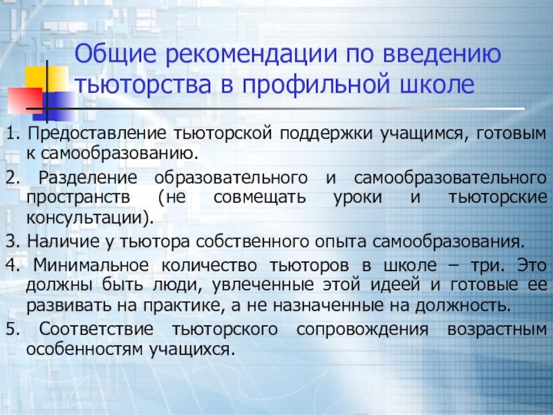 Слайд 16Общие рекомендации по введению тьюторства в профильной школе