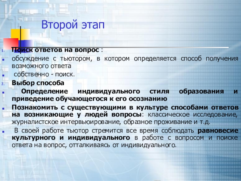 В своей работе тьютор стремится все время соблюдать равновесие культурного и индивидуального в работе с вопросом и поиске ответа на вопрос, отталкиваясь от индивидуального.