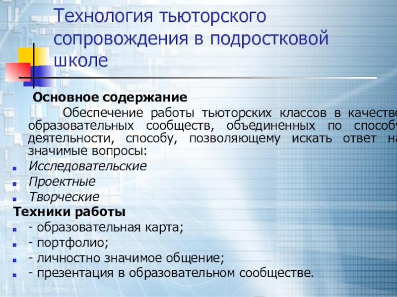 Слайд 18Технология тьюторского сопровождения в подростковой школе