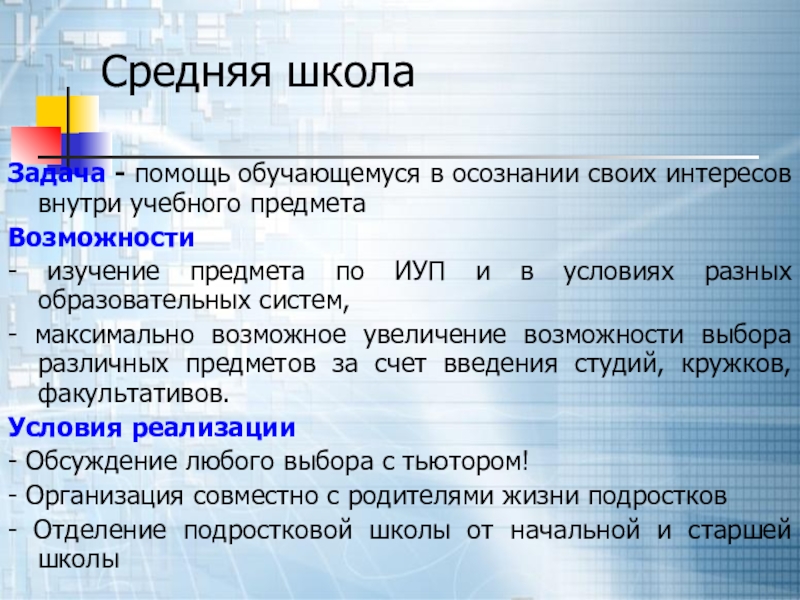 - максимально возможное увеличение возможности выбора различных предметов за счет введения студий, кружков, факультативов.