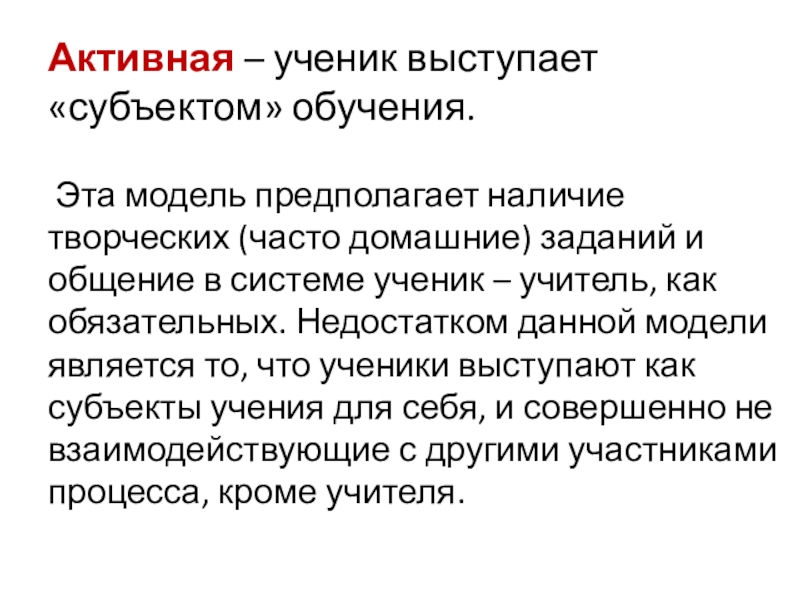 Слайд 5Активная – ученик выступает «субъектом» обучения.