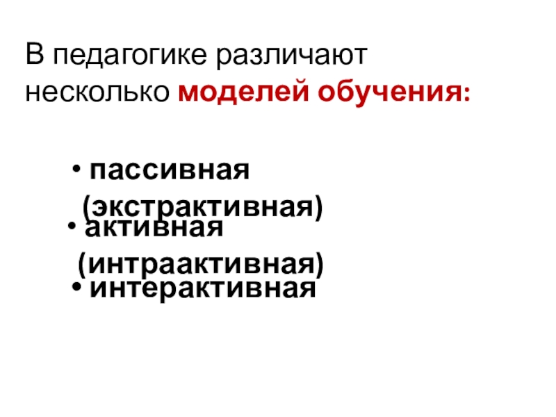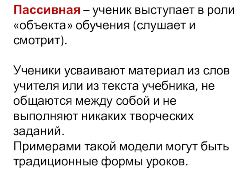 Слайд 4Пассивная – ученик выступает в роли «объекта» обучения (слушает и смотрит).