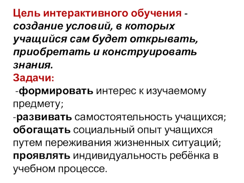 Слайд 9Цель интерактивного обучения - создание условий, в которых учащийся сам будет