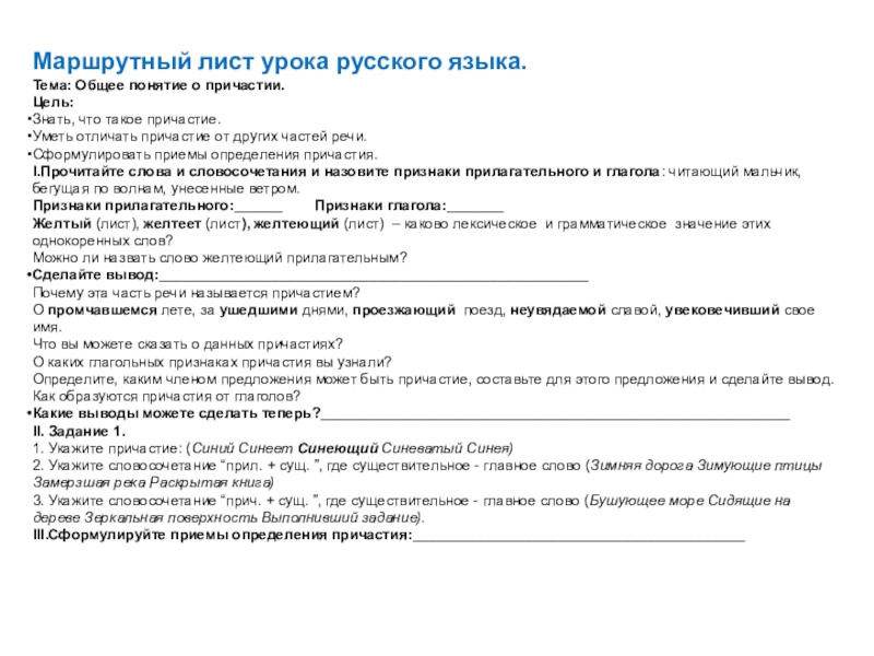 I.Прочитайте слова и словосочетания и назовите признаки прилагательного и глагола: читающий мальчик, бегущая по волнам, унесенные ветром.