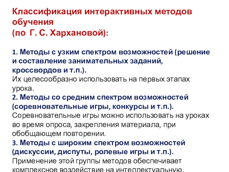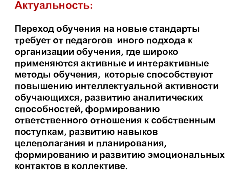 к организации обучения, где широко применяются активные и интерактивные методы обучения, которые способствуют повышению интеллектуальной активности обучающихся, развитию аналитических способностей, формированию ответственного отношения к собственным поступкам, развитию навыков целеполагания и планирования, формированию и развитию эмоциональных контактов в коллективе.