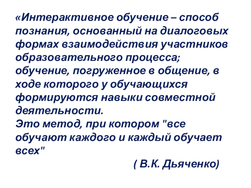 Слайд 7«Интерактивное обучение – способ познания, основанный на диалоговых формах взаимодействия участников