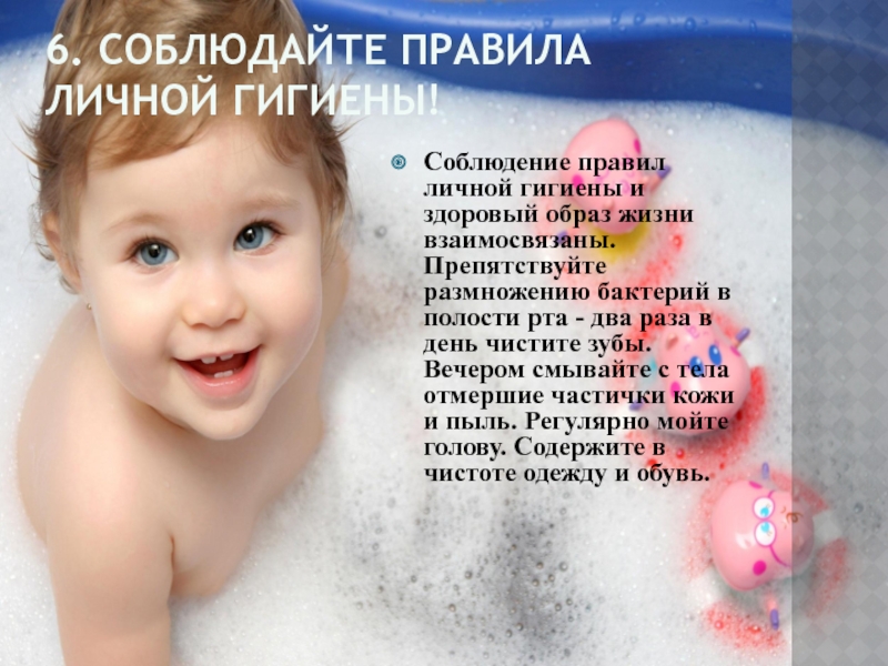жизни взаимосвязаны. Препятствуйте размножению бактерий в полости рта - два раза в день чистите зубы. Вечером смывайте с тела отмершие частички кожи и пыль. Регулярно мойте голову. Содержите в чистоте одежду и обувь.