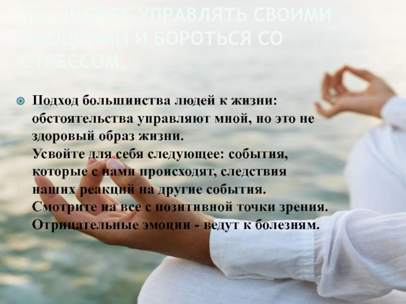 Слайд 1310. Умейте управлять своими эмоциями и бороться со стрессом.