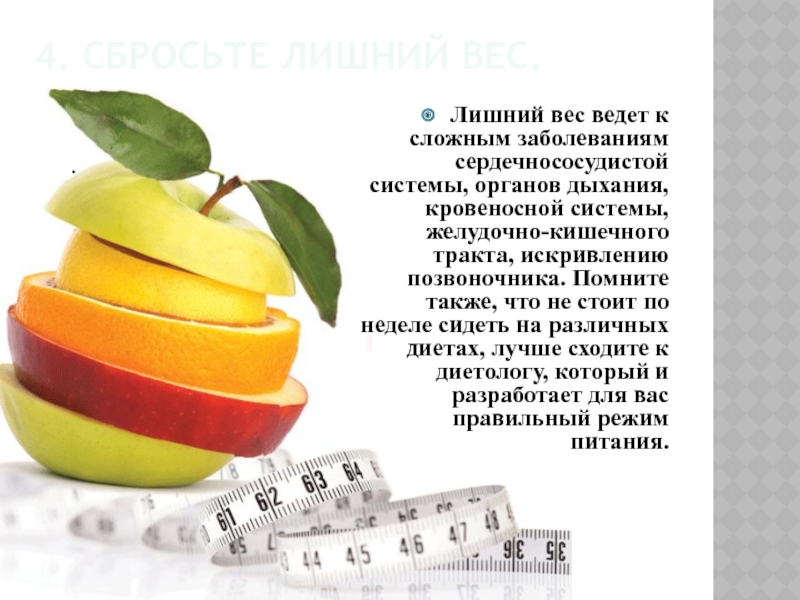 органов дыхания, кровеносной системы, желудочно-кишечного тракта, искривлению позвоночника. Помните также, что не стоит по неделе сидеть на различных диетах, лучше сходите к диетологу, который и разработает для вас правильный режим питания.