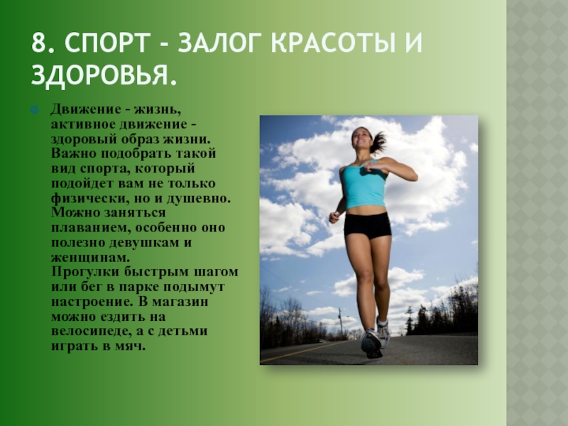 - здоровый образ жизни. Важно подобрать такой вид спорта, который подойдет вам не только физически, но и душевно. Можно заняться плаванием, особенно оно полезно девушкам и женщинам.