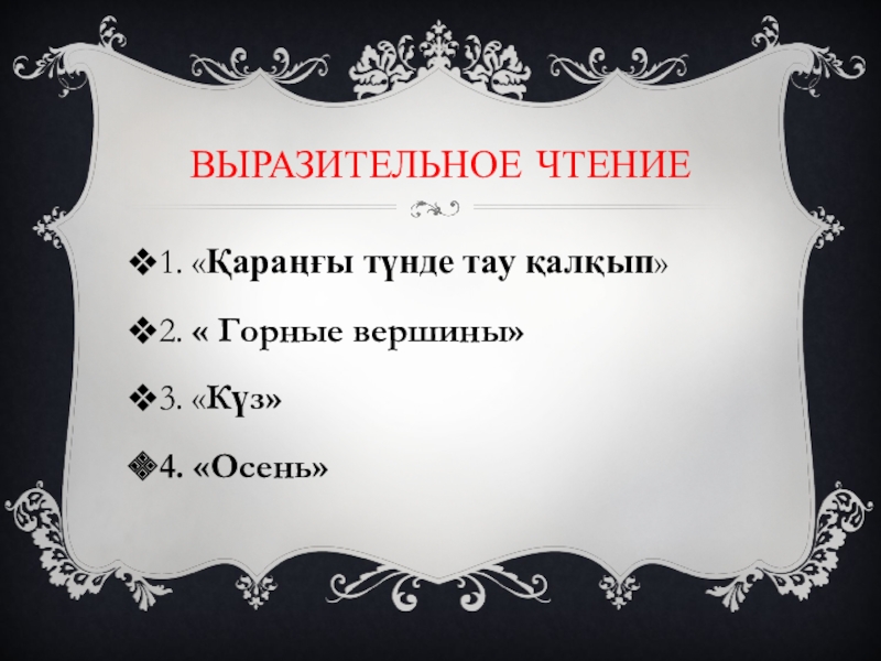 Выразительное чтение1. «Қараңғы түнде тау қалқып»2. « Горные вершины»3. «Күз»4. «Осень»