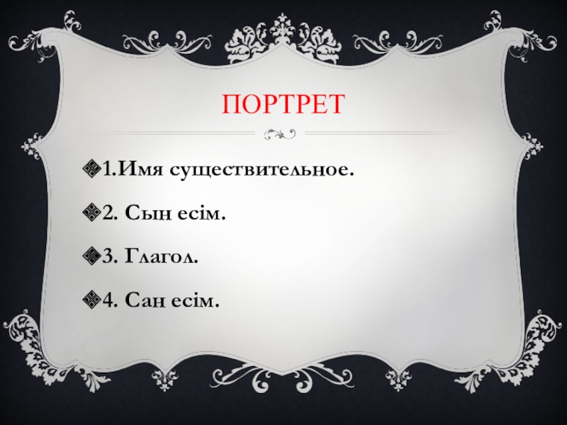 Портрет1.Имя существительное.2. Сын есім.3. Глагол.4. Сан есім.