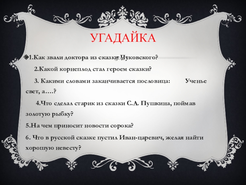 Угадайка1.Как звали доктора из сказки Чуковского?   2.Какой корнеплод стал героем сказки?   3. Какими